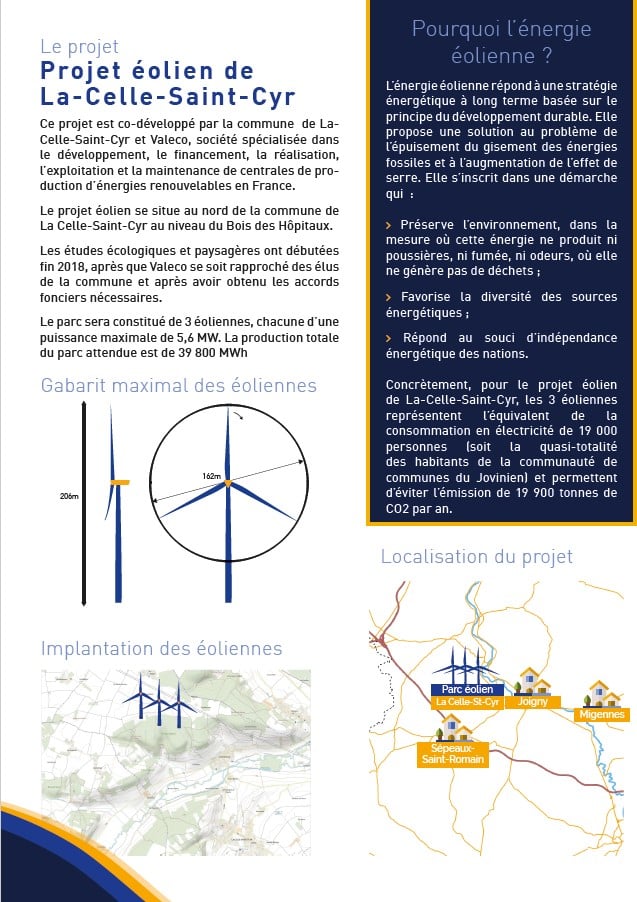 Situé sur la commune de la Celle-Saint-Cyr (89), le projet sera composé de 3 éoliennes qui produiront l’équivalent de la consommation en électricité de 19 000 personnes (soit la quasi-totalité des habitants de la communauté de communes du Jovinien !)